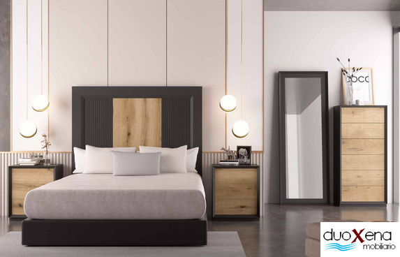 Dormitorio compuesto de cabecero, 2 mesitas de noche, comoda 5 cajones y espejo.
